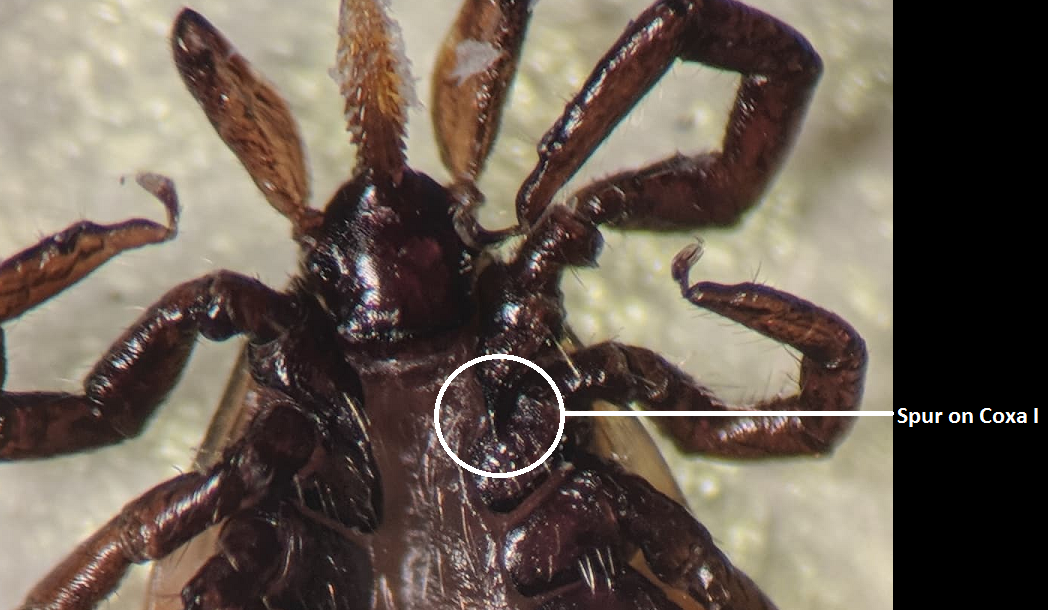 The coxa is the part of the tick that connects the leg to the body. Ticks have four coxae and four legs. Deer ticks will have a spur on the first coxa (coxa I) that is not too long or short. They will also have smaller spurs on the 2nd, 3rd, and 4th coxa.